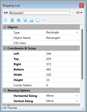 By replacing the value “Auto size” with “Set size”, the size of the form will then be based on the values entered (in pixels) in the Width and Height fields. Now, we will move the rectangle out of the form and make it visible again.